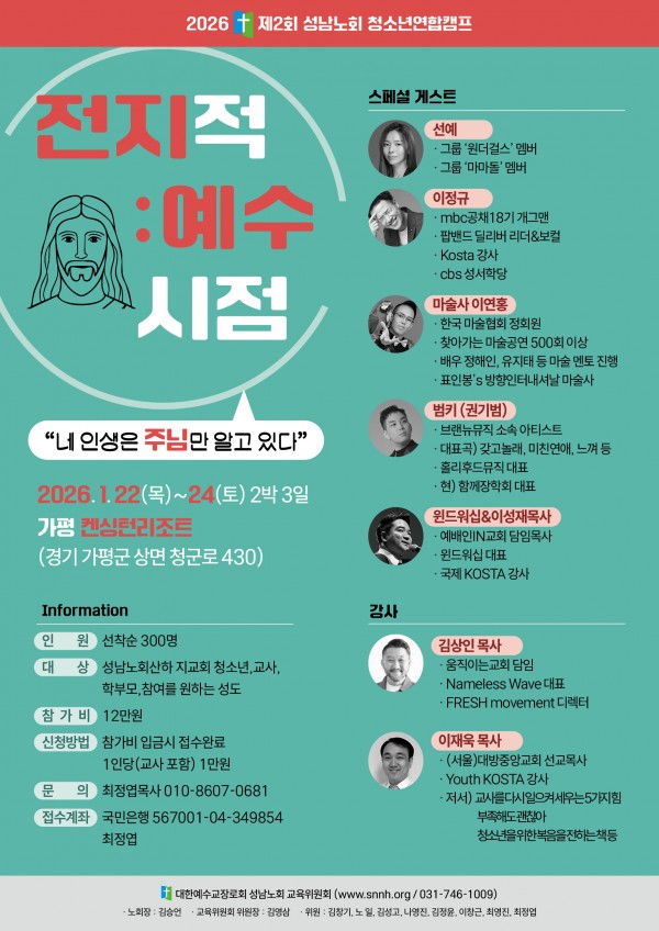 중고등부 학생들이 수련회에 참여합니다. 0 137 01.17 16:53 일시 : 2026년 1월 22일(목)~24일(토) 장소 : 가평켄싱턴리조트주제 : "네 인생은 주님만 알고 있다"성남노회 교육위원회에서 주최하는 연합수련회에 참여합니다. 주님을 만나서 넘치는 은혜를 받고 세상으로 돌아와 세상을 비추는 빛으로 살아가도록 기도해주세요.