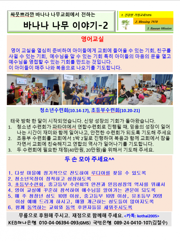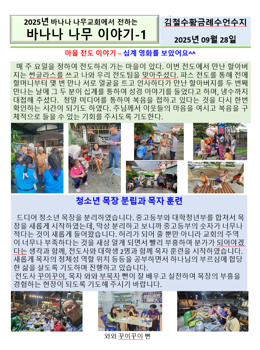 사뭇쁘라간에 파송한 김철수선교사의 기도편지입니다. 0 23 10.11 13:39 목사님감사합니다^^저희 가정 파송된 날입니다.어려운 상황속에서도 눈물로 헌신하신 목사님의 열정과 복음을 향한 목사님의 그 섬김에 진심으로 감사드립니다.어느 덧 3년 차가 되었습니다.우리 하나님의 은혜와 축복이 교회와 목사님 가족 가운데 넘치시길 바라며 감사드립니다.