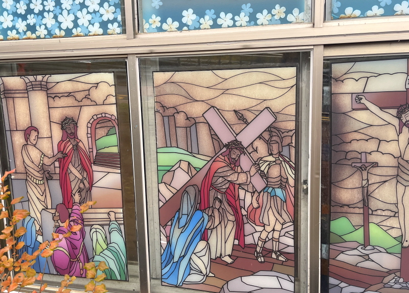 유리창에 성화시트지가 시간이 지나고 햇빛에 타서 변색이 되었어요.