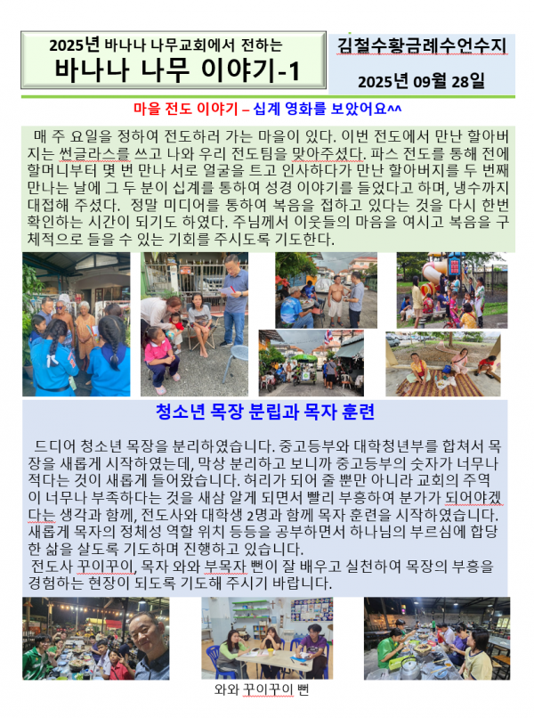 사뭇쁘라간에 파송한 김철수선교사의 기도편지입니다. 0 35 10.11 13:39 목사님감사합니다^^저희 가정 파송된 날입니다.어려운 상황속에서도 눈물로 헌신하신 목사님의 열정과 복음을 향한 목사님의 그 섬김에 진심으로 감사드립니다.어느 덧 3년 차가 되었습니다.우리 하나님의 은혜와 축복이 교회와 목사님 가족 가운데 넘치시길 바라며 감사드립니다.